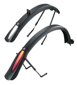 Комплект крыльев TOPEAK DeFender iGlow TX, 28", черные, с фонарем для дорожного велосипеда. Широкие, предназначены для шин до 700х44c, оснащены встроенными фонарями для повышения заметности в темное время суток.