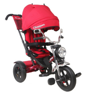 Велосипед 3-х колесный с ручкой управления Chopper. Необычный внешний вид велосипеда. Надувные колеса 12 и 10 дюймов. Функциональная фара со световыми/звуковыми эффектами повторяющая мотоцикл Чоппер. Амортизаторы переднего колеса. Зеркала заднего вида. Холостой ход переднего колеса. Холостой ход руля. Поворотное на 180 градусов сиденье. Мягкая наклонная спинка. Трехточечный ремень безопасности. Мягкая накладка на сиденье. Съемная/складная колясочная крыша. Регулируемая по углу наклона крыша. Стояночный тормоз. Крылья на задних колесах. Разъемная/съемная дуга безопасности. Дополнительные подножки для малышей. Складные подножки. Корзина с крышкой. Съемный козырек на молнии. Сумочка на ручке управления. Регулируемая по высоте ручка управления.